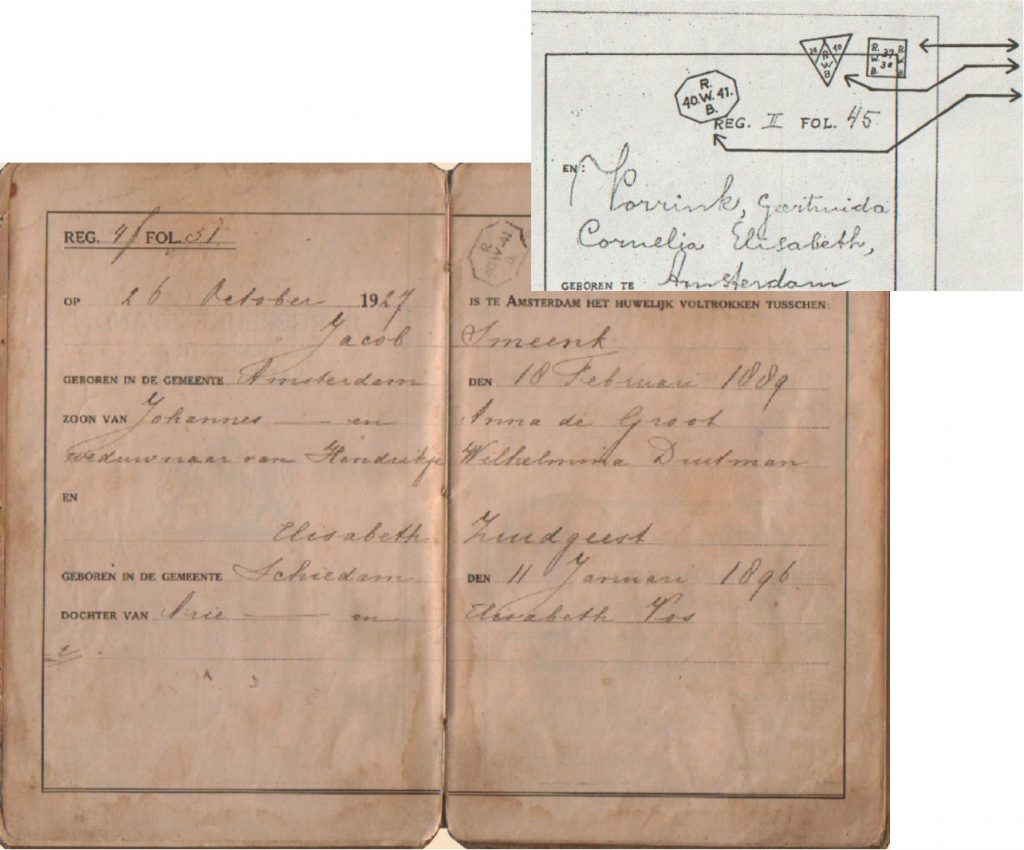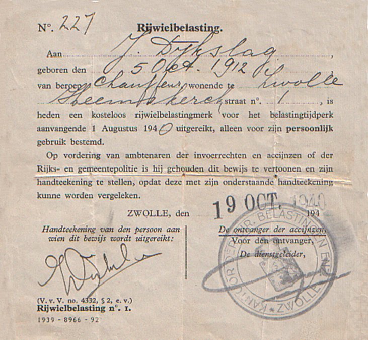 Afbeeldingen van stempel in een trouwboekje of z.g. stamkaart (armen inschrijving) ter verkrijging van een kosteloos rijwielbelastingplaatje.