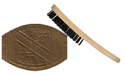 Hij leende een rijwielplaatje van een goede bekende en legde dat vlak op een stuk hout. Daaroverheen spande hij een stuk latoenkoper, wat hij stevig vast maakte om niet te kunnen verschuiven. Met een stevige staalborstel klopte hij de onder liggende afbeelding erin. Het redelijke resultaat was in c.a. 10 minuten gemaakt. Het werd in model geknipt en in een metalenhouder gedaan om het maar zo echtmogelijke te laten lijken.